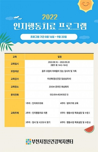 부천시정신건강복지센터 김신겸센터장은 “음주 문제로 어려움을 겪고 있는 분들과 그 가족들이 부천시정신건강복지센터의 알코올 교육 프로그램에 참여해 건강한 사회 구성원으로 생활할 수 있기를 기대한다”고 전했다.