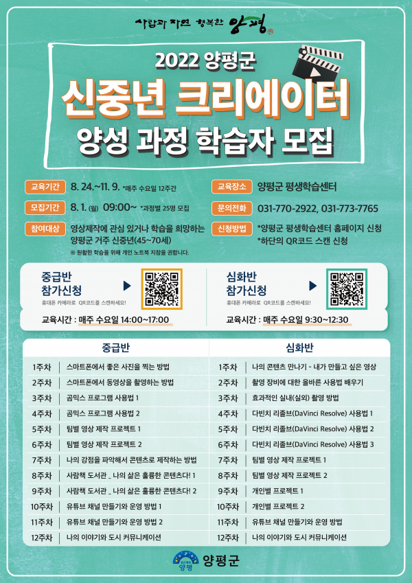 모집인원은 각 운영 과정별 25명으로 컴퓨터 활용이 가능하고 영상 제작에 관심 있는 신중년이면 누구나 군 평생학습센터 홈페이지를 통해 신청하면 된다.