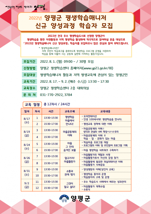 이번 교육은 총 12회차의 교육과정으로 8월 17일부터 9월 2일까지 매주 수·금요일 2회 운영하며 평생학습 마을에서 만나다 마을공동체의 이해 마을 그 안의 숨겨진 보물 알고 가자 마을활동가 소통과 관계 맺기 그것이 알고싶다 등의 주제로 주제별로 2회차씩 교육이 진행된다.