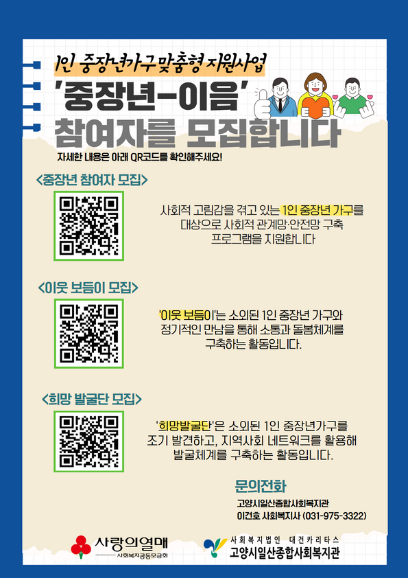 ‘중장년-이음’ 참여 희망자는 고양시일산종합사회복지관 방문 및 전화, 홈페이지, 포스터 내 QR코드를 통해 신청할 수 있다.