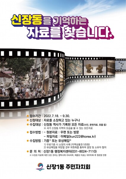 수집 기간은 9월 말까지이며 대상 자료는 사진, 문서 영상 등 과거 신장동 지역 주민들의 삶과 지역의 모습들이 담겨 있는 모든 자료로써, 신장동 지역의 변천사와 주민의 추억이 깃든 자료라면 모두 가능하다.
