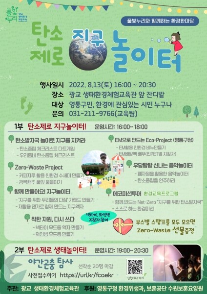 수원시 광교생태환경체험교육관 관계자는 “코로나19와 더위로 지친 시민들이 ‘탄소제로 지구놀이터’에 참여해 즐거운 추억도 만들고 탄소중립을 위한 실천 방법도 함께 생각해보는 시간이 될 것”이라고 말했다.
