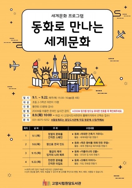 ‘동화로 만나는 세계문화’는 초등학교 2~5학년 어린이를 대상으로 운영되며 나라별 동화를 함께 읽고 의식주·기후·문화유적을 학습하고 매 시간 다양한 독후 활동을 진행한다.