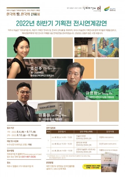 이번 강연은 홈페이지, 전화 예약을 통해 대면으로 진행하며 강연 영상을 제작해 18일 이후부터 아트뮤지엄 려 홈페이지와 유튜브 채널, 여주시 박물관·미술관 홍보 밴드에서 시청할 수 있도록 게시할 예정이다.