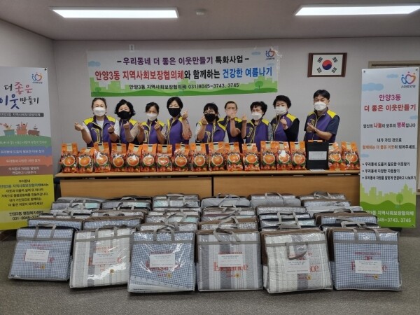 안양3동 지역사회보장협의체 위원들이 여름이불세트, 삼계탕, 호박죽 등으로 구성된 여름나기 물품을 직접 준비하고 저소득층 40가구에 방문해 전달하면서 주변 어려운 이웃들의 안부를 살폈다.