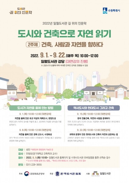 문화체육관광부가 지원하는 ‘2022년 길 위의 인문학 사업’ 프로그램인 ‘도시와 건축으로 자연 읽기’는 자연과 인간의 공간이 균형을 이루며 생태적으로 공존해 나가는 방법과 미래 사회에 펼쳐질 도시재생에 대한 새로운 패러다임을 알아보는 강좌다.