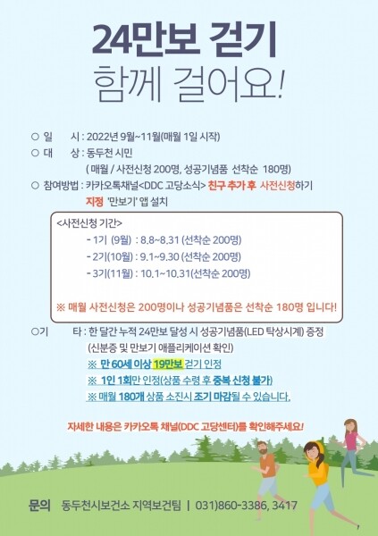 시 관계자는 “이번 행사를 통해 걷기 운동과 같은 올바른 생활습관을 실천할 수 있는 계기가 되어 심뇌혈관질환을 예방할 수 있기를 바라며 나아가 동두천 시민들이 건강한 삶을 누릴 수 있도록 최선을 다하겠다”고 전했다.