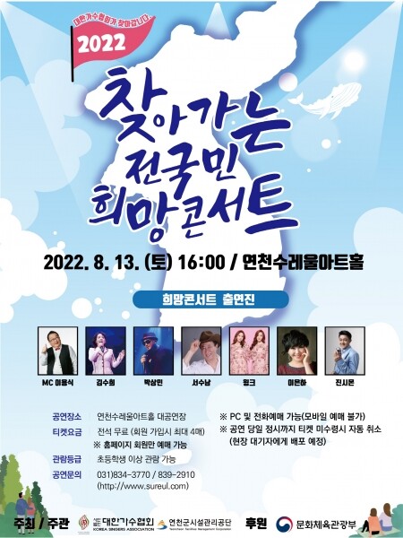 ‘2022 찾아가는 전국민 희망콘서트’는 사단법인 대한가수협회와 문화체육관광부가 선사하는 문화복지 콘서트로 티켓 오픈 전부터 많은 관심을 받고 빠르게 판매됐다.