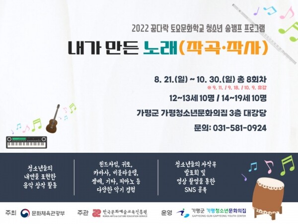 청소년 송캠프는 음악 창작 활동으로 청소년들이 주체적으로 다양한 악기를 경험해보고 작곡을 할 수 있도록 총 9명으로 구성된 전문 강사진과 함께 운영한다.