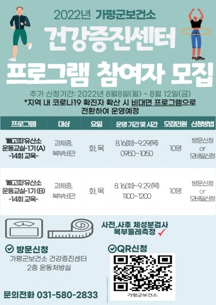 신청기간은 8월 8일부터 8월 12일까지이며 ‘가평군보건소 건강증진센터’ 카카오 채널을 통해 참여 신청서를 작성해 제출하면 신청이 가능하다.