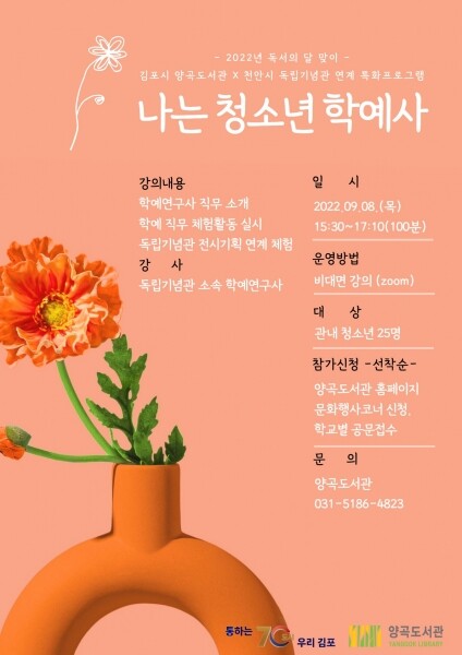 강좌접수는 8월 8일 월요일부터 김포시립도서관 홈페이지의 문화행사 코너 신청 및 학교 공문 동시 접수를 통해 선착순으로 진행한다.