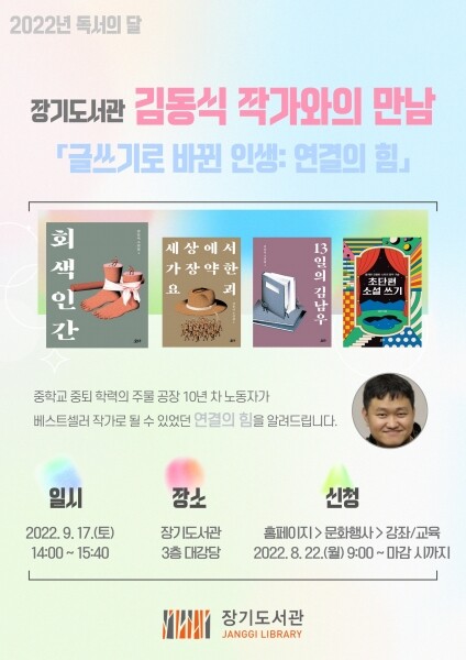 이번 작가와의 만남은 ‘글쓰기로 바뀐 인생’이라는 주제로 중학교 중퇴 학력의 주물 공장 10년 차 노동자가 베스트셀러 작가로 될 수 있었던 글쓰기와 연결의 힘에 대해서 다룰 예정이다.