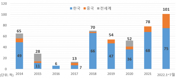한편 선가지수는 `20.11월 코로나 영향으로 저점을 기록한 이후 지속적으로 상승 중이며 `22.7월에는 161.57을 기록함으로써 `09.1월 이후 162개월 만에 최고치를 기록했다.