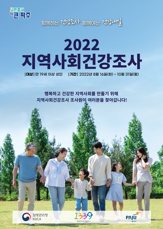 임미숙 파주시보건소장은 “주민건강통계는 파주시 지역 보건 및 건강수준 향상에 활용되므로 건강조사가 원활히 이뤄질 수 있도록 시민 여러분의 협조를 부탁드린다”고 말했다.
