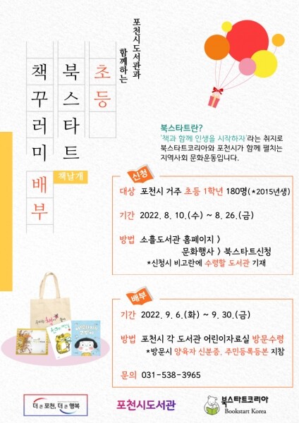 이번 사업은 문화체육관광부·한국출판문화산업진흥원과 북스타트코리아·책읽는사회문화재단에서 진행하는 ‘2022 초등북스타트 꾸러미 지원사업’에 포천시립도서관이 운영기관으로 선정되어 진행하게 됐다.
