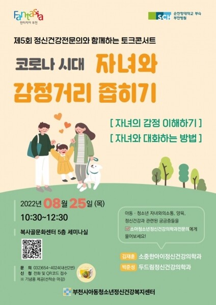 부천시보건소 김은옥 건강도시과장은 “이번 토크콘서트를 통해 자녀와의 소통, 양육, 정신건강과 관련된 궁금증을 해소하고 더불어 아동청소년의 건강한 성장을 위해 시민들이 함께 공감대를 형성할 수 있는 기회가 되기를 바란다”고 말했다.