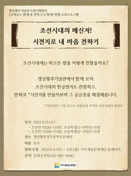 재단 관계자는 “이번 프로그램은 디지털 문화가 익숙한 어린이들이 조선시대의 시전지를 직접 만들고 손편지를 써보는 시간을 통해 편지가 주는 새로운 의미를 알게 될 것”이라고 밝혔다.