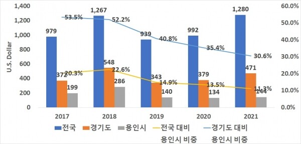 용인시의 반도체 수출 실적과 비중을 보면, 전국 및 경기도 대비 비중이 감소한 것을 넘어 절대액 자체가 감소했다을 확인할 수 있다.