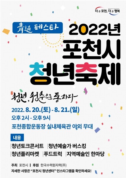 한편 포천시는 2022년 청년의 날을 기념하기 위해 9월 17일 유명 작가 하상욱을 초대해 청년 및 일반시민을 대상으로 인문강연을 개최할 예정이다.