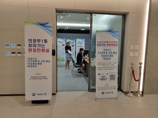의정부역 센트럴자이&위브캐슬아파트 2,500여 세대 입주민의 민원행정 접근성 제고를 위해 운영되는 ‘찾아가는 현장 민원실’에서는 전입신고 주민등록 등초본 발급, 전입세대 열람 및 임대차계약 신고 등의 민원서비스를 평일 10시부터 오후 5시까지 제공하고 있다.