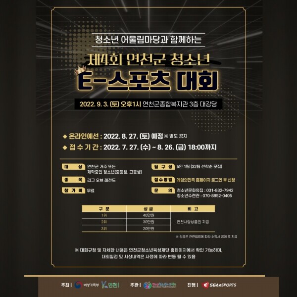 청소년어울림마당과 함께하는 제4회 연천군 청소년 E-스포츠 대회 관련 자세한 문의 사항은 연천군청소년문화의집로 문의하면 된다.
