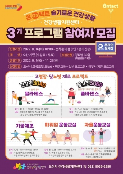 프로그램 참여를 원하는 시민은 8월 16일 10:00부터 오산시 교육포털 오늘e를 통해 신청할 수 있으며 계획된 인원에 따라 선착순으로 마감될 예정이다.