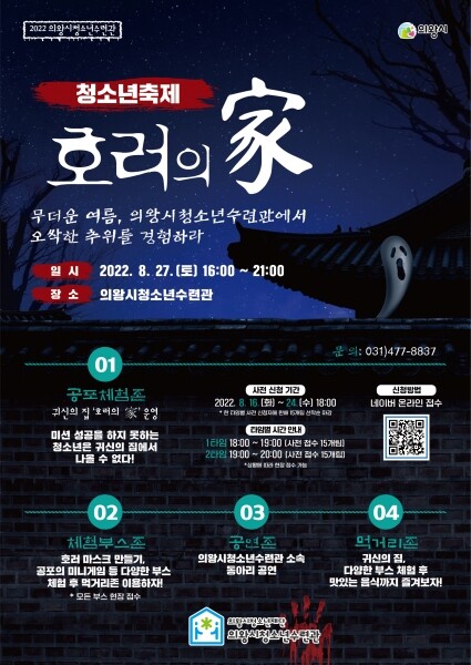 한여름 밤 무더운 여름을 오싹하게 이겨낼 수 있도록 ‘공포’,‘호러’라는 주제로 진행되는 이번 청소년축제는 의왕시청소년재단 자치기구 및 동아리가 직접 기획하고 운영하는 11개의 부스에서 프로그램이 진행될 예정이다.