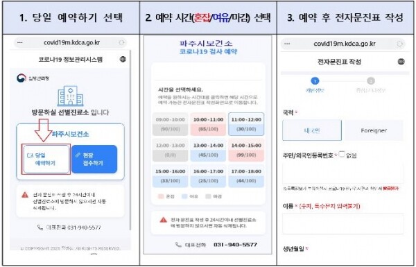 예약 방법은 보건소에서 제공하는 문자나 앱을 통해 코로나19 정보관리시스템에 접속해 원하는 시간대를 선택하고 전자문진표를 작성하면 되며 예약이 완료되면 문자메시지가 발송된다.