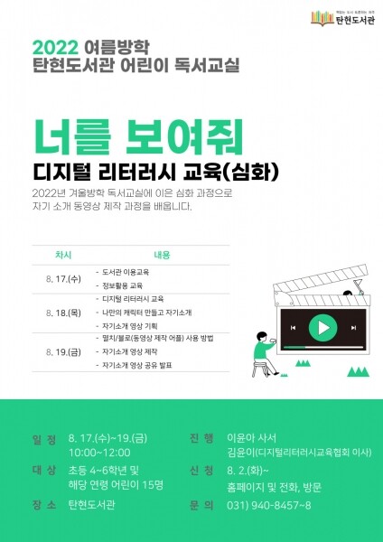 지난 1월에 운영한 겨울방학 독서교실 ‘유튜브에 빠진 너:디지털 리터러시 교육’의 후속 심화 과정의 일환으로 진행되는 이번 교육은 디지털 매체 친화력과 문해력을 높일 수 있도록 참여형 프로그램으로 기획했다.