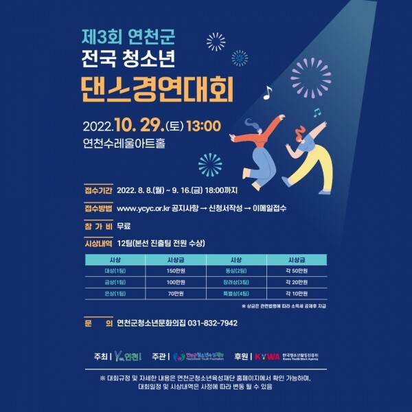제3회 연천군 전국 청소년 댄스경연대회는 10월 29일 연천수레울아트홀에서 개최되며 3년만에 대면 대회로 진행한다.