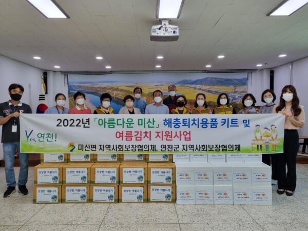 미산면 지역사회보장협의체의 아름다운 미산 나눔 지원사업으로 추진한 이 날 사업은 장마와 무더운 날씨로 인해 건강을 위협받고 있는 취약계층 가구에 미산면지역사회보장협의체 위원이 가정방문해 여름철 해충과 습기를 퇴치 할 수 있는 해충퇴치용품 키트 및 연천군 지역사회보장협의체 지원 읍면 특화사업인 여름김치를 지원함으로써 무더운 여름 우리 이웃들의 안부를 확인하고 건강상태를 살펴보면서 더불어 함께 나누는 따뜻한 사랑을 전했다.