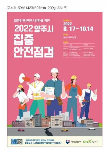 시 관계자는 “대한민국 안전대전환을 위한 ‘2022년 양주시 집중 안전점검’추진을 통해 시민 안전과 직결된 시설물 위험요소를 점검하고 해결해 시민의 안전을 도모하는데 최선을 다하겠다”고 말했다.