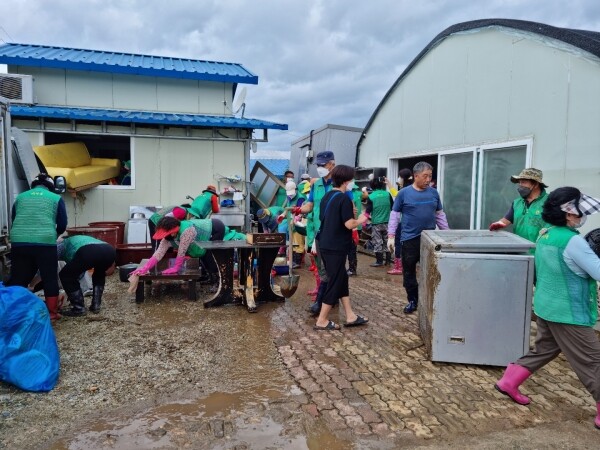 이날 새마을회 회원 40여명은 주택과 마당 안으로 밀려 들어온 토사를 제거하고 바닥 청소 및 침수된 가구·가전 제품을 처리하는 등 수해 복구에 구슬땀을 흘렸다.