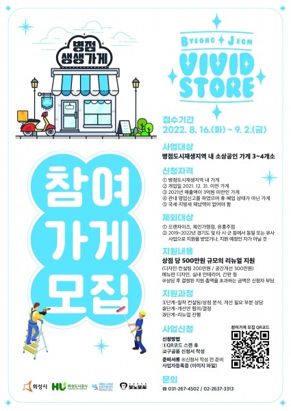 모집대상은 병점 도시재생 활성화 지역 내 소상인이며 포스터 내 QR코드 스캔 또는 병점 도시재생현장지원센터에서 신청서 작성을 통해 접수하면 된다.