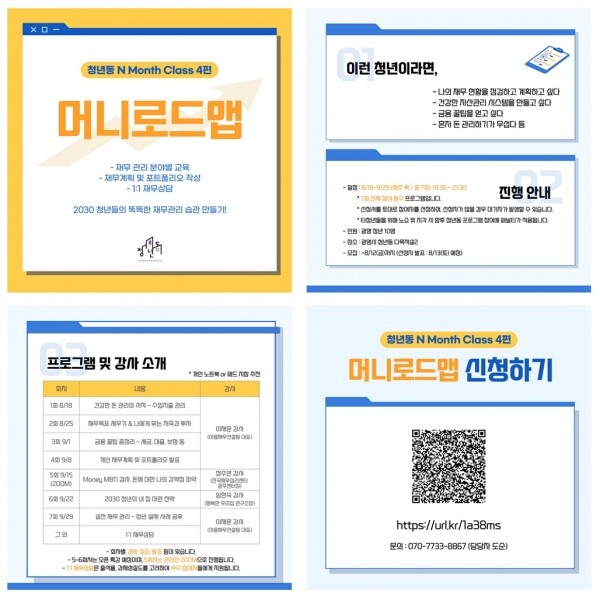 ‘머니로드맵’은 건강한 돈 관리의 시작, 수입 지출 관리 나의 재무 목표 세우기 & 나에게 맞는 저축과 투자 꼭 알고 가야 할 금융 Tip 총정리 개인별 재무계획 및 포트폴리오 발표 머니프레임 검사를 통해 알아보는 ‘나의 Money MBTI’ 2030 청년의 내 집 마련 전략 청년 실전 사례 공유 및 Q&A 등 총 7회 강좌로 진행된다.