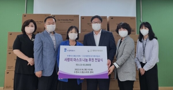 오서진 ㈔대한민국가족지킴이 이사장은 16일 오후 3시 수원시 드림스타트 영화센터를 방문해 마스크 4만 3000매를 전달했다.