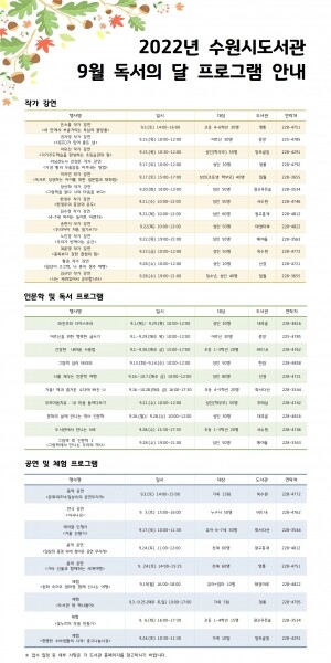 수원시 관계자는 “변화하는 독서 환경에 발맞춰 시민들이 다채롭게 참여할 수 있는 풍성한 독서문화 프로그램을 마련했다”며 “올가을에는 많은 시민이 독서 활동으로 공감과 치유의 시간을 보내길 바란다”고 말했다.