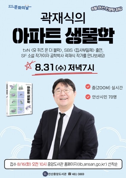 강연 접수는 안산중앙도서관 누리집 문화강좌 게시판에서 선착순으로 70명까지 접수 가능하다.