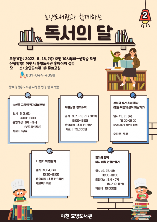 효양도서관 독서의 달 행사는 8월 18일 목요일 오전10시부터 이천시통합도서관 홈페이지를 통해 선착순으로 접수 후 참여할 수 있다.