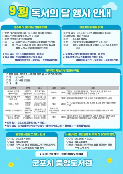 군포시 도서관정책과장은 “독서의 달을 맞아 준비한 다양한 행사를 통해 시민들이 책으로 소통하고 독서의 즐거움을 느낄 수 있는 기회가 되길 바란다”고 말했다.