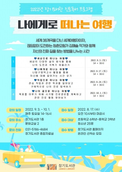 ‘나에게로 떠나는 여행’ 강연은 2022년 공공도서관 진로독서 프로그램 운영지원 공모사업의 일환으로 장기도서관의 청소년 대상 진로독서 프로그램 중 2번째 강연이다.