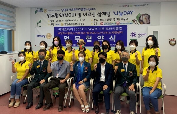 남양주가운로타리클럽은 업무 협약식에 이어 코로나19 팬데믹으로 우울감을 겪고 있는 독거 및 소외계층 어르신 350여명을 위해 복날 맞이 ‘삼계탕 나눔 DAY 행사’를 위한 삼계탕을 후원했으며 삼계탕은 복지관 무료급식 어르신과 화도·수동·호평·평내 지역 내 재가 대상 및 맞춤 돌봄 어르신들께 제공됐다.