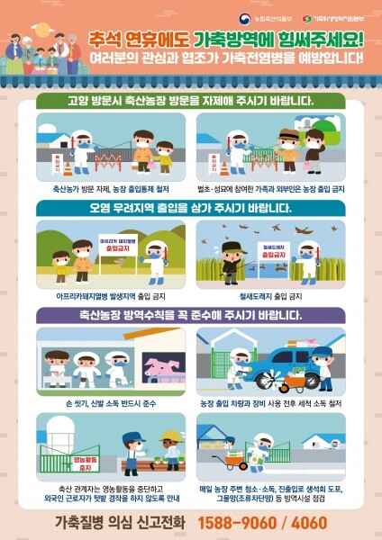 또한 축산농가가 야생멧돼지의 출몰이 잦은 지역에서의 성묘와 벌초 작업, 텃밭 경작 등 영농활동을 자제하고 농기계와 차량의 농장 출입을 금지할 것을 당부하는 한편 오염 우려가 있는 농장 내외부에 대해 매일같이 소독하고 멧돼지 등 야생동물이 농장으로 출몰하지 못하도록 울타리와 그물망 등의 설치 여부를 점검할 계획이라고 전했다.