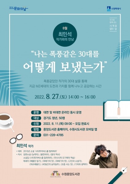 수원시 관계자는 “작가, 방송인, 뮤지션 등으로 활동하며 다양한 연령대의 독자들과 소통하고 있는 최민석 작가와의 만남이 치열한 삶을 살아가는 청년들에게 힘이 되길 바란다”고 말했다.