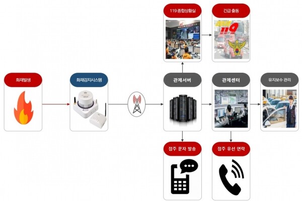 전통시장에 구축된 화재경보장치는 불꽃·연기·온도 3가지 화원을 감지하고 점포별 화원이 감지됐을 때 관제센터에서 해당 점주에게 문자 발송 및 전화 등의 알림을 통해 화재 상황을 신속하고 정확하게 전달하는 역할을 한다.
