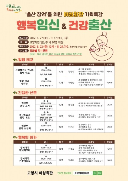 ‘행복 임신&건강 출산’ 특강은 임신과 출산을 맞이한 고양시민과 관내 직장을 다니고 있는 산모수첩소지자 등 100명을 대상으로 8월 27일부터 9월 17일까지 운영된다.