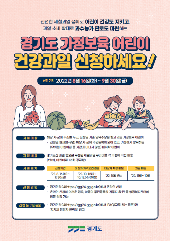 10월에 자격요건 확인 작업을 거친 후, 11~12월 중 경기도에서 생산된 제철 과일로 구성된 과일 꾸러미가 각 가정으로 배송될 예정이다.