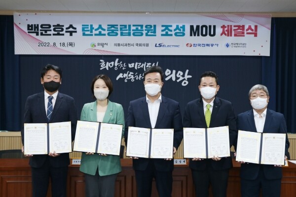 이날 협약은 의왕시 이소영 의왕·과천국회의원 LS일렉트릭 한국전력공사 한국에너지공단이 함께 백운호수 내 모든 전기에너지를 친환경 에너지로 공급하는 ‘탄소중립공원’조성과 관련해 상호 협력을 약속했다.