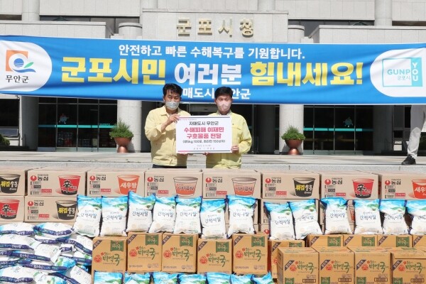 16일 군포시의 자매도시인 전남 무안군은 수해 소식을 접하고 쌀, 컵라면, 화장지 등 총 600만원 상당의 구호물품을 직접 실어와 이재민 임시 거주시설 관계자에게 전달했다.