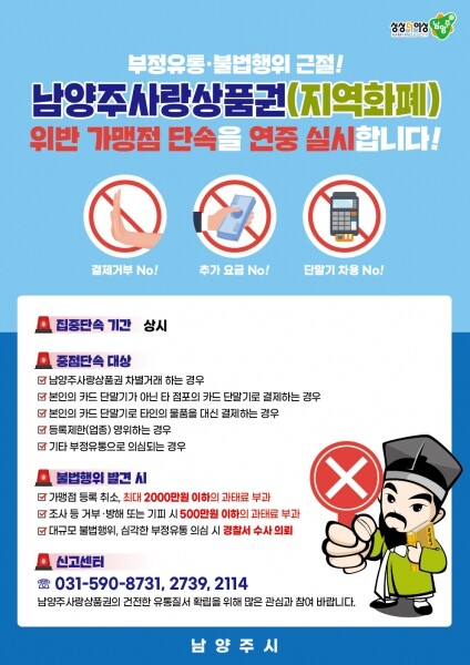 시 관계자는 “이번 집중 단속 기간 운영으로 남양주사랑상품권의 부정 유통을 근절하고 지속적인 모니터링을 통해 건전한 유통 질서를 확립할 수 있도록 최선을 다하겠다”고 밝혔다.